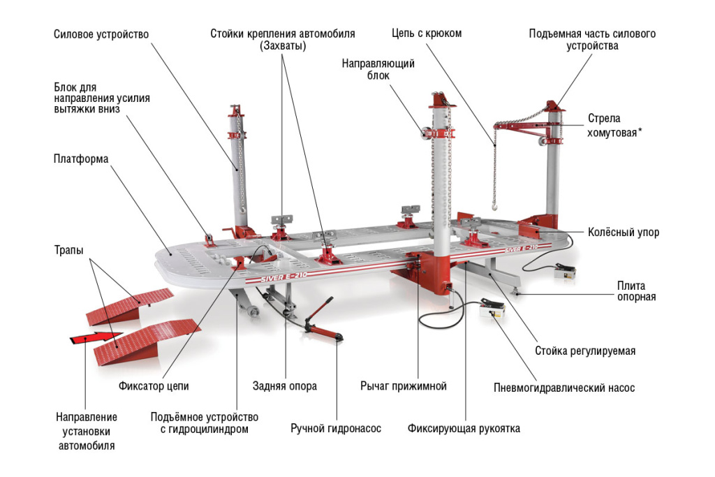 Стапель SIVER E-210 предназначен для восстановления кузовов автомобилей. Имеет классическую американскую конструкцию с большой платформой и силовыми устройствами башенного типа. Два силовых устройства перемещаются непосредственно по платформе.